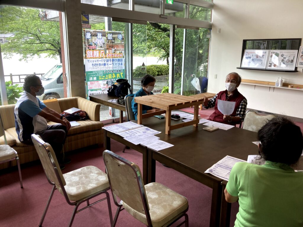 今回から八鶴館のホールを使えるので、ホール内で細川先生のお話を聞きながら、雨足が静まってくるのを待ってました。ただそうしている間に八鶴湖の湖水があふれてきて、これ以上溢れたら避難しようと思うくらいでした。