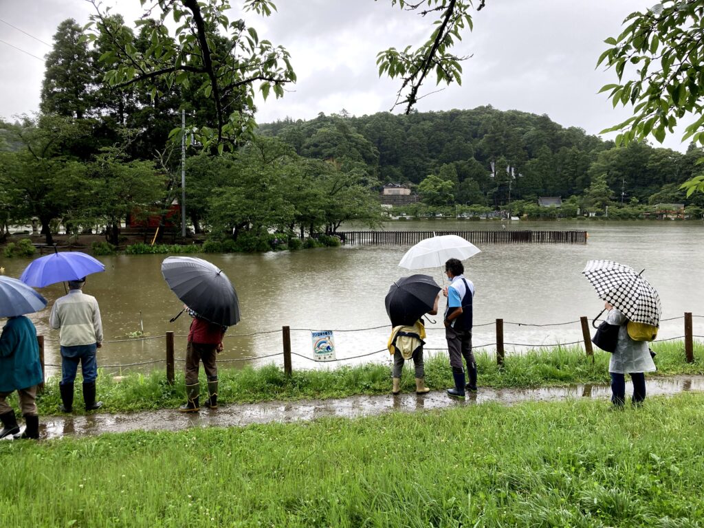 遊歩道まで水面が上がってきたところで、小雨になって水位はそこまでで落ちつきました。