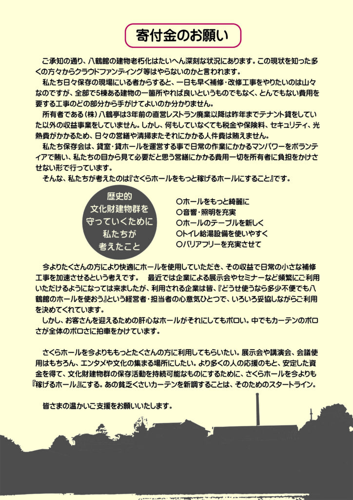 ご承知の通り、八鶴館の建物老朽化はたいへん深刻な状況にあります。この現状を知った多くの方々からクラウドファンディング等はやらないのかと言われます。私たち日々保存の現場にいる者からすると、一日も早く補修・改修工事をやりたいのは山々なのですが、全部で5棟ある建物の一箇所やれば良いというものでもなく、とんでもない費用を要する工事のどの部分から手がけてよいのか分かりません。