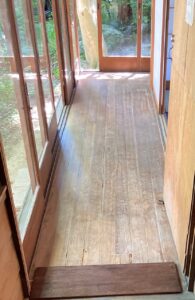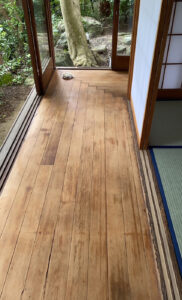 丁寧にこすっていくと、雨による水シミや白抜けなど経年染みついた汚れが解消して、本来の木の風合いが出てきました。