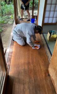 床ワックスチームは、最初水溶きワックスで表面についた汚れをこすり取って、それから蜜蝋のワックスを塗り広げます。