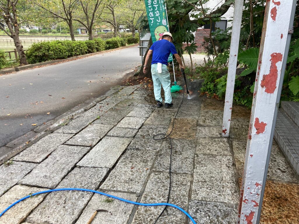 高圧洗浄機を借りてきて、敷石1枚ずつ丁寧に汚れを落としていきます。