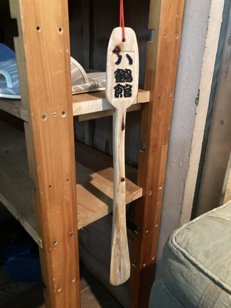 八鶴会(やつるかい)の会員にはハンドメイドのストラップが渡されます。エッチングした『八鶴館』の文字を木片に1枚1枚丁寧に焼印して、裏には筆で番号を手書きして根付用の紐を通しています。